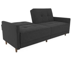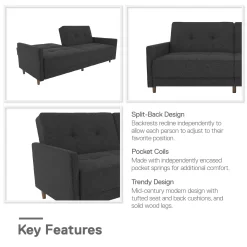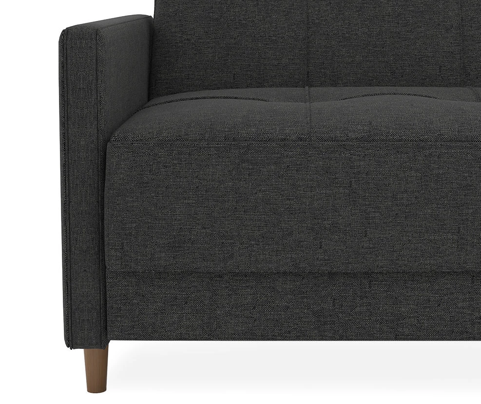 The Avianna futon offers a sofa sleeper option in elegant gray with a sophisticated design. The sleek tufted upholstery with mid-century modern inspired designs gives this futon a unique appeal perfect for your home or apartment’s décor! Exposed wooden legs deliver style, with additional center legs designed to add extra stability. While the core is built with sturdy wood, this futon has comfortable cushions that are made with independently encased coils. The split-back construction allows adjustment options to anyone sitting on it for the back angle, reclining, lounging or sleeping position. You can now sit and read a book while someone else relaxes or open fully for sleeping. The Avianna is compact enough for tight living spaces while offering big style and comfort!