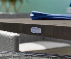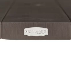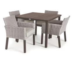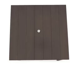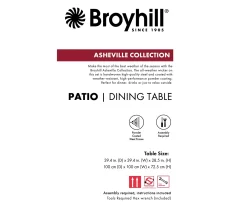 Gather outdoors for conversation and delicious meals around the Asheville dining table by Broyhill. The square shape table features a powder-coated steel frame hand painted to look like wood with a slat-style top. Complete with a convenient umbrella hole for shading your favorite spot, this dining table is an elevated addition to a patio or deck.