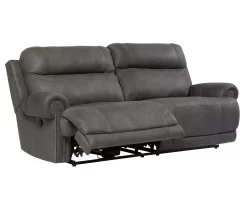 Take the weight off your feet with this sleek gray sofa from Ashley. Sparing you that puffy look you might expect from a recliner, this reclining sofa doesn’t hold back when it comes to contemporary style. Subtle touches such as sporty jumbo stitching, nail head trim and a weather worn effect on the upholstery give this handsome piece a buttoned-up appeal that brings a fresh feel to your living or family room.