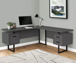 Give your home office a promotion with this extra-large, corner computer desk with three storage drawers. Finished in a modern gray laminate that matches the desktop, this thick-panel, L-shaped floating desktop provides plenty of room for you to spread out everything you need to be productive. And, with two small drawers and one large drawer with a bar for hanging files, you’ll have tons of space for the items you want to keep off your work surface.