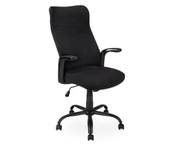 Sleek and contemporary, this office chair brings a simple chic look to any workspace. Upholstered in a durable and breathable polyester black fabric, this multi-position high back office chair with a 360-degree swivel has a convenient lever to adjust the seat height with a lock-in and free tilt mechanism so you can sit back and work in ultimate comfort. The ergonomically designed back rest, thick cushioned seat and rounded armrests, accented with grooved lines, all support long hours of sitting. The chair has a solid five-star black base over hooded nylon wheels for a smooth movement.