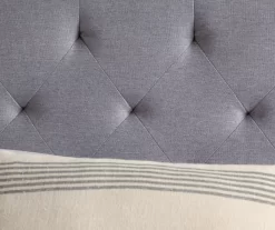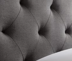 - Upholstered in a stone gray linen-inspired fabric