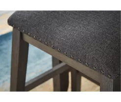 Perfect portion. Striking a simply chic pose, this counter-height dining room table set serves up high style on a smaller scale. Its antiqued gray wash finish gives the clean-lined design a casually cool sensibility. Ideally sized for dinner for two or as an impromptu workspace, side shelves cleverly balance form and function. Covered in a textured gray fabric, each stool’s cushioned seat goes easy on the body.