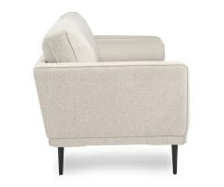 This designer sofa from Ashley combines the clean lines of mid-century style with the cozy softness of your favorite blanket to create your new favorite piece of furniture. The textured chenille upholstery evokes a feeling of comfort and security while the faint chevron pattern, bolster pillows and exposed black metal legs add sophistication. A great addition to a living or family room.