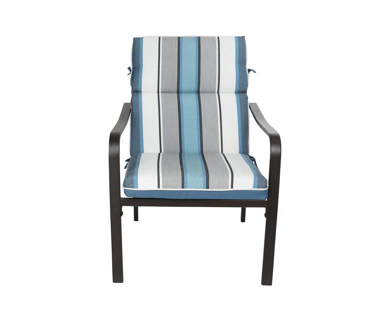 Create comfort in your outdoor space with this chair cushion. Offering a two-in-one look with stripes on one side and a solid hue on the other, the high back design features a stylish corded edge as sewn seams define the head pillow, back cushion and seat. Made of high performance solution dyed polyester fabric that is fade, stain, mold and mildew resistant, the cushion is complete with tie strings that secure it in place on a chair’s frame.
