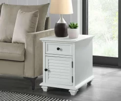 Introduce a coastal Southern look to your home with the Broyhill Charleston end table. Offering convenient and thoughtful storage solutions, this side table features a casual, yet genteel appearance with a classic shuttered door and white sapele veneer. Use it at the side of your furniture to elegantly store and stylishly display your items.