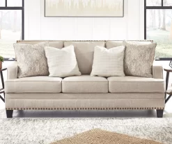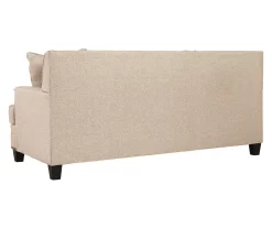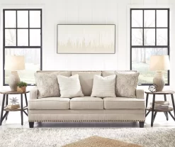 A case of contemporary and classic style influences coming together in a beautiful way, this sofa in beige brings a fresh perspective to modern farmhouse living. Distinctive elements include t-cushions that wrap around setback track arms, nailhead trim and a lovely linen-weave upholstery for an up-to-date feel. Muted hue designer throw pillows master the art of subtlety.