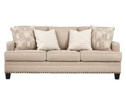 A case of contemporary and classic style influences coming together in a beautiful way, this sofa in beige brings a fresh perspective to modern farmhouse living. Distinctive elements include t-cushions that wrap around setback track arms, nailhead trim and a lovely linen-weave upholstery for an up-to-date feel. Muted hue designer throw pillows master the art of subtlety.
