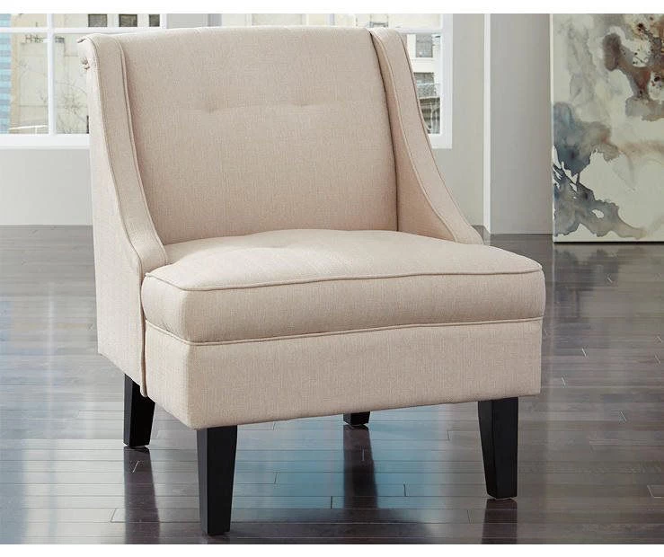 This beautiful cream accent chair from Ashley adds a touch of class and sophistication to any space. The wingback design paired with the classic slipper chair look make the perfect combination. Designed with tapered legs, clean lines and subtle tufting this chair brings instant appeal and endless beauty to your seating space.
