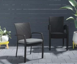 - Transitional chairs with a classic black woven weather resistant wicker design