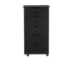 This eight-drawer rolling storage cart is a versatile storage solution for your office, kitchen, bedroom or anywhere where organization is needed. Solidly constructed from pine wood and finished in a handsome black, the six equal size and two deep drawers are finished with an ample top that can go next to a desk or craft table to put items within reach. Soft contoured handle cut outs are easy on the touch and create a clean, modern look. Drawers can be easily removed and used as a tray to transport your items to your workspace, while casters make this piece mobile to go into any room easily.