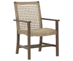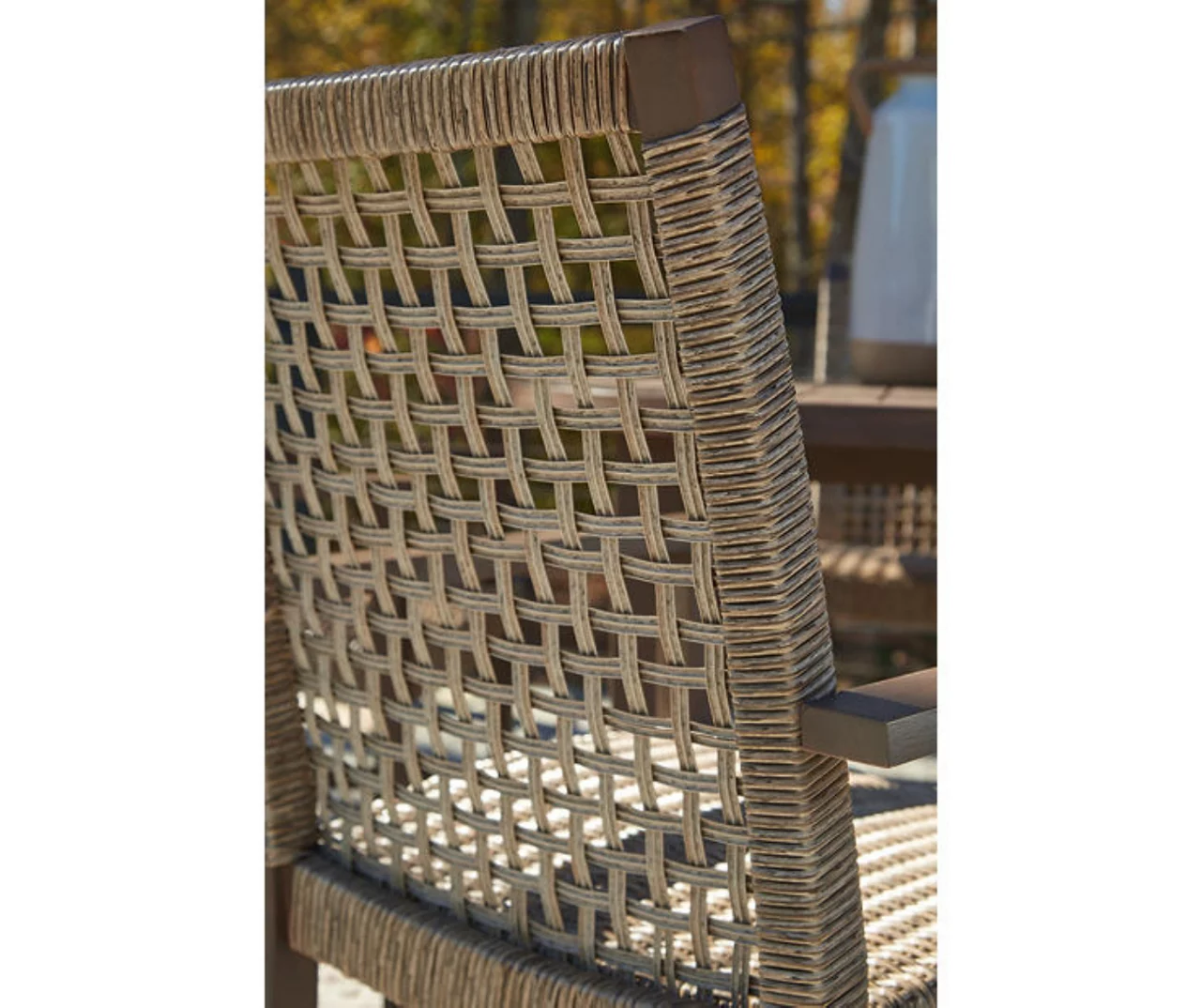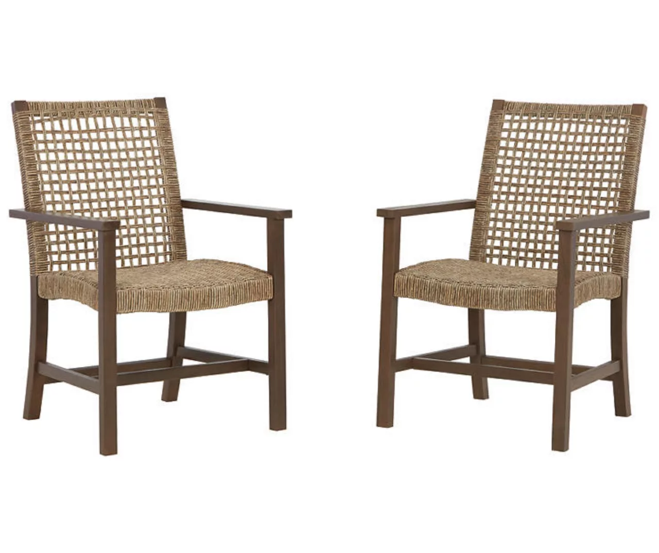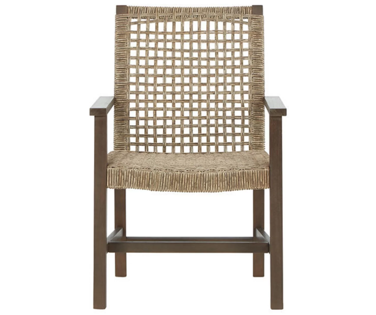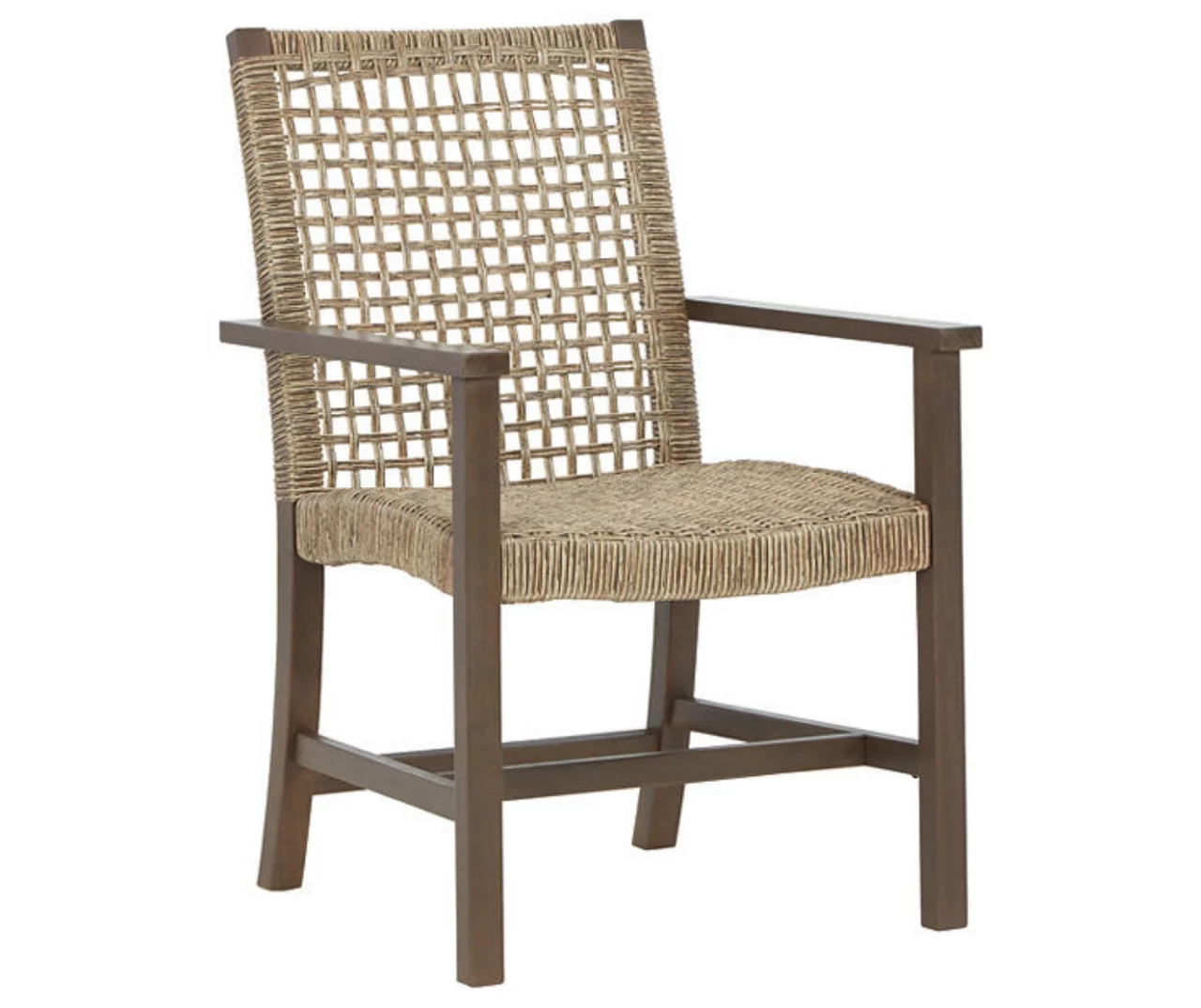 Dream weaver. Round out your indoor or outdoor living space with the naturally beautiful look of wood and wicker. This armchair set will serve up seasons of worry-free dining in your sunroom, on your back deck or sitting pretty poolside. The chair’s open-weave design is made from woven resin and eucalyptus wood, for the perfect merger of high fashion and lasting durability.