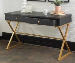 Incorporate stunning style into your home with this eye-catching desk. Versatile yet striking, this desk features a crisp gold finish that accentuates the sharp, trestle-style frame. The contrasting black top gives this piece a neutral yet chic effect. Top it with flowers, a lamp or framed photographs and this desk will inject style into an empty space or creates a dynamic workspace in a bedroom or living room.