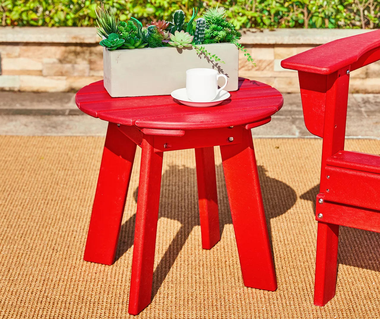 Keep your favorite items nearby outdoors on this Adirondack style side table. Constructed of durable and all weather-resistant high-density polyethylene, the table is very easy to clean and needs almost no maintenance. This patio side table is small but mighty. Just set your lovely flowers, snacks, drinks or cocktails to enjoy a good time!
