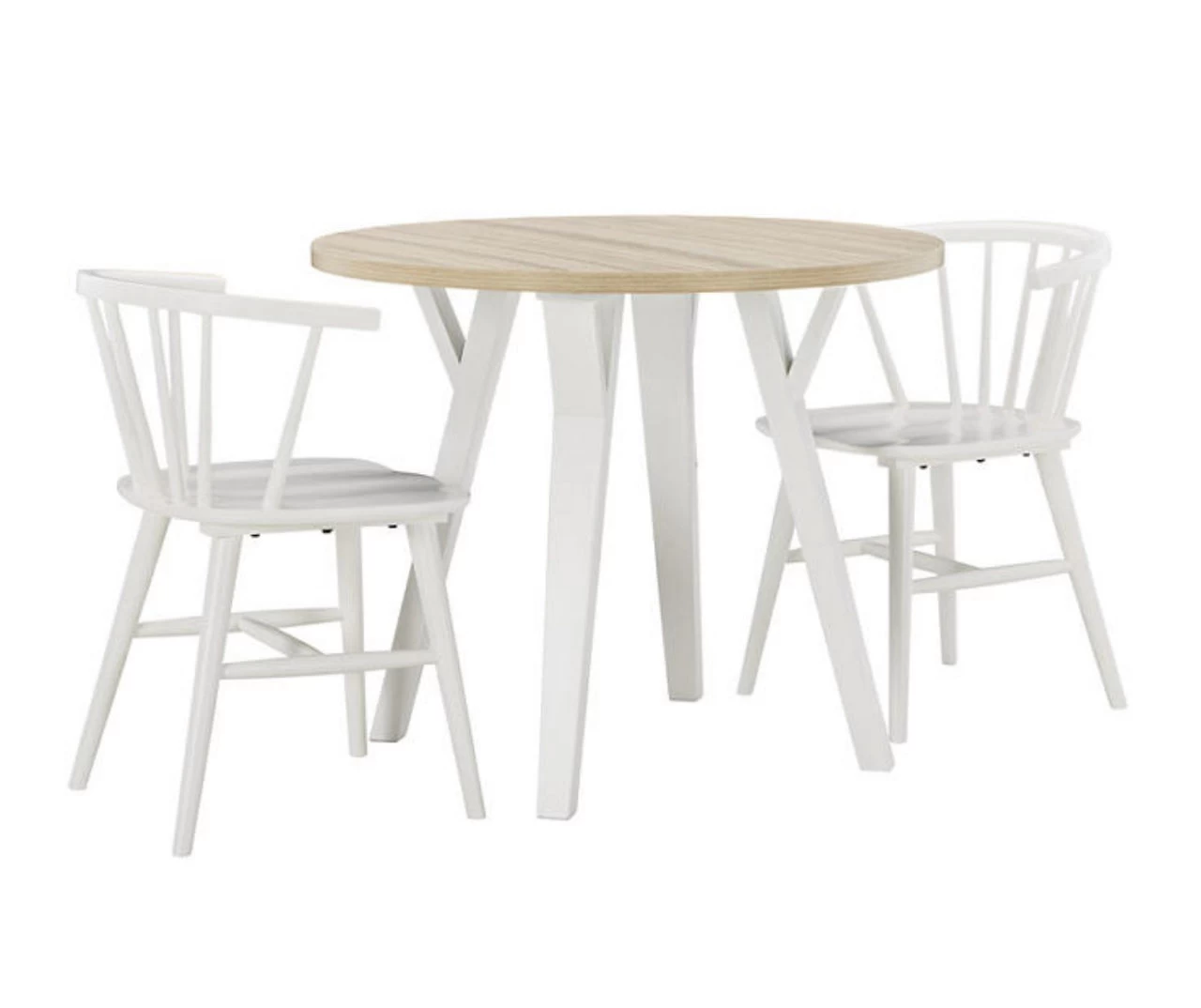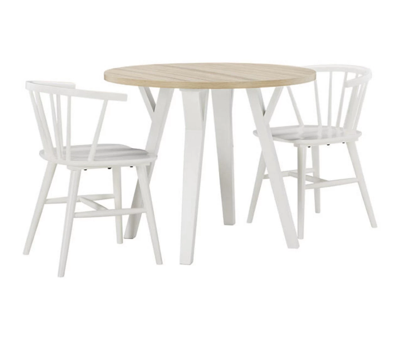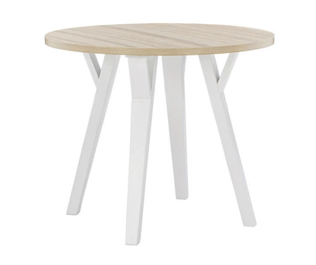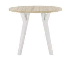 Bring light to your dining area with clean lines and a bright two-tone finish. The round dining table sports stylized saber legs in a white finish for beautiful simplicity. The melamine top in a light tan color provides additional durability, marrying minimalism with big style for a delightful combination.