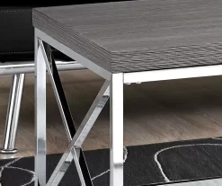 Inspired by clean lines and a simplistic, yet modern feel, this gray wood-look and chrome metal coffee table offers a contemporary allure that will make you feel comfortable in your living room, office space or den. With the smoothest of thick panel surfaces, its gray finish warms up your living space, while the crisscross chrome metal legs are both sturdy and shiny to complement the table top.
