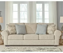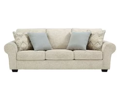 Blending classic elements like sumptuous flared roll arms with tailored box cushions and tapered black feet for up-to-date appeal, this sofa exudes that transitional aesthetic that looks and feels right at home. Offering plenty of room for everyone to make themselves comfortable, this large-scale sofa is wrapped in a soft, chunky weave fabric loaded in texture. Light and lovely ivory upholstery makes for such an easy-breezy blend.