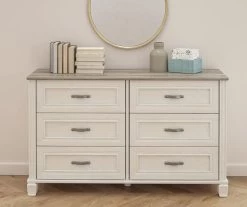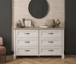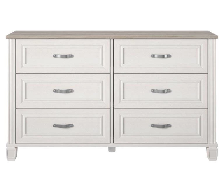 Give your bedroom an instant upgrade with the Ameriwood Home Hillview dresser. Finished with a white finish and a contrasting woodgrain top, the dresser offers six drawers providing plenty of storage for your clothes, accessories and more. Complete with pewter silver drawer pulls, decorative feet and molding, this dresser is a created piece that will look great for years.