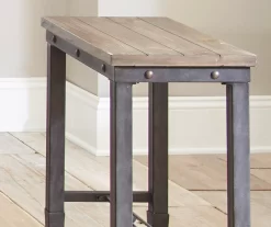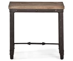 Take industrial design to a new level with the Jersey chairside end table. The simulated plank top, riveted iron sides and industrial designed stretchers are combined for that restoration look without being bulky. Sturdily constructed using engineered hardwoods and pine veneers in a warm, antiqued tobacco finish.