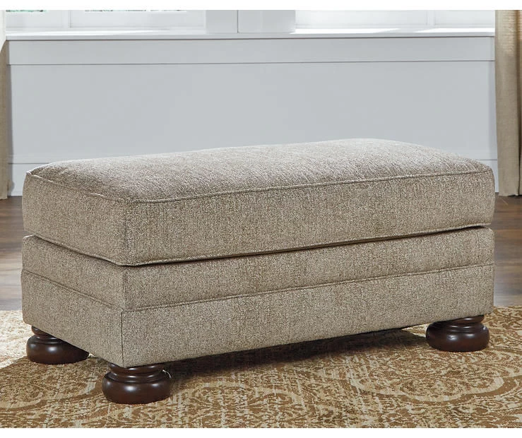 The sumptuously styled Kananwood ottoman proves that a richly traditional look doesn’t have to break the bank. Choice of a plush chenille upholstery in oatmeal is earthy elegance at its best. Distinctively turned bun feet in a dark finish add to the ottoman’s substantial presence.