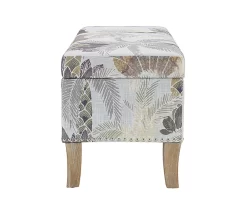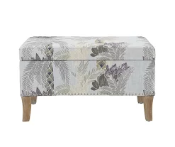 Keep clutter at bay with this versatile storage ottoman featuring durable fabric printed with a blue and green palm tree pattern in soft hues. The cushioned, upholstered top also provides additional comfortable seating. Place at the foot of a bed, in any entryway or use as an ottoman for an airy, coastal touch and convenient yet stylish functionality.