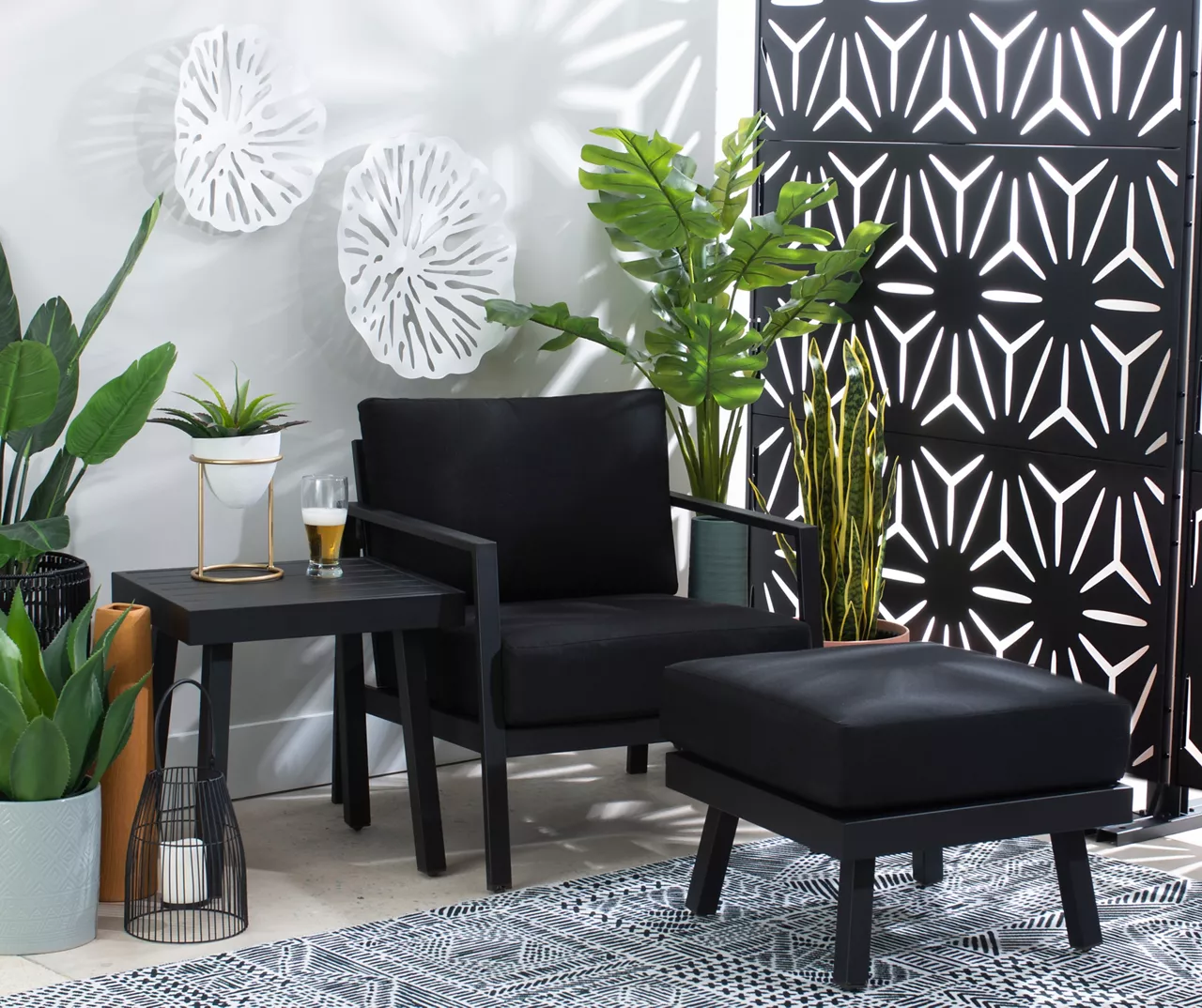 Sleek, comfortable and well suited for the great outdoors, this modern chair is the perfect addition to your patio, porch or rooftop. The black powder coated aluminum frame is resistant to rust and incredibly lightweight for ease of transport when you want to shimmy into the sun. Plus, there’s no need to worry about your cushions losing their color after only a few seasons, as the black Sunbrella fabric is fade, stain and mold resistant! Sit back and enjoy tomorrow’s style and comfort for years to come.