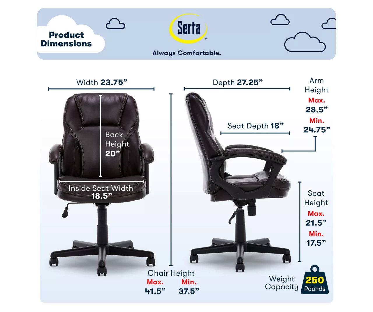 From a brand that is synonymous with quality, comfort and style, the Serta Mitchell manager office chair is upholstered in soft and durable roasted chestnut brown PureSoft vegan leather. This chair features deep layered body pillows which offer the body a serene and tranquil seating experience. The contoured lumbar provides exceptional support for the lower back, while the sculpted arms have pillow soft pads which provide added hand, wrist and forearm comfort. The pneumatic gas lift adjusts the seat height by a simple flick of the lever. Pulling out the same handle will unlock the recline mechanism and allow you to lean back in comfort.