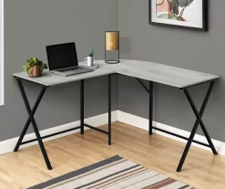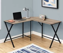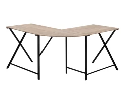 When you don’t have a lot of space but need to setup your own workstation, then start with this minimalist, contemporary style, L-shaped corner computer desk. The two spacious work surfaces, finished in a smooth dark taupe wood look laminate, are brought together with a curved corner piece giving you maximum space to spread out your documents, place your laptop, a lamp and a few office accessories. Everything is visible and within reach with this convenient corner desk that is supported with solid black metal frame and cross legs at each end, bringing the simplicity up a notch.
