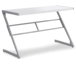 With a sturdy Z-shaped silver frame lends contemporary look to any home office, living room, or guest bedroom. The ample surface offers plenty of room for a monitor, laptop, lamp and other office essentials. Its compact size, finished on all sides, makes a great addition to a smaller home office, studio or dorm room.