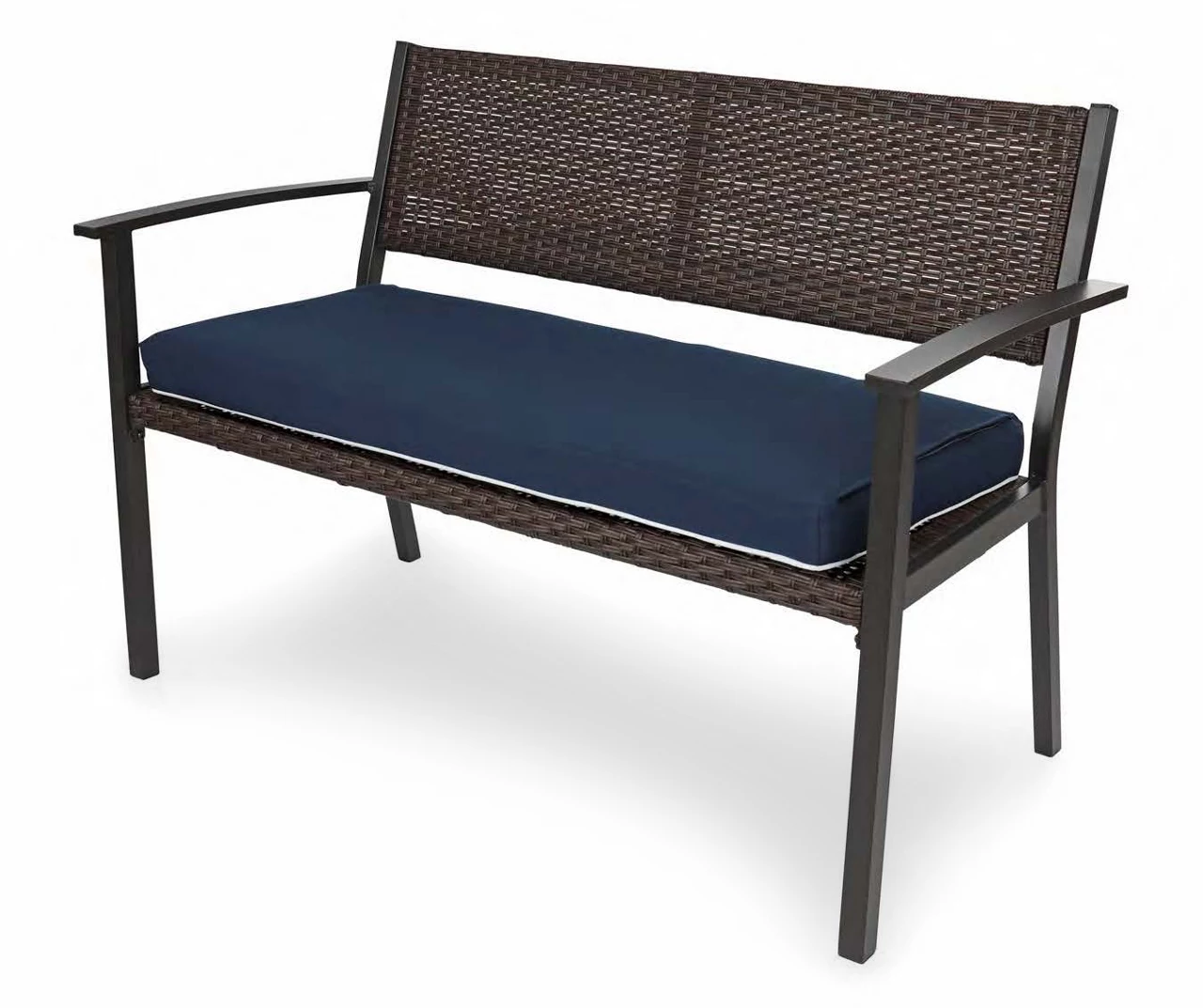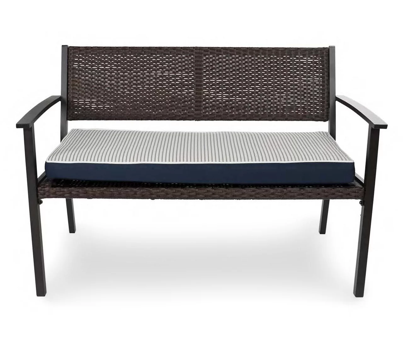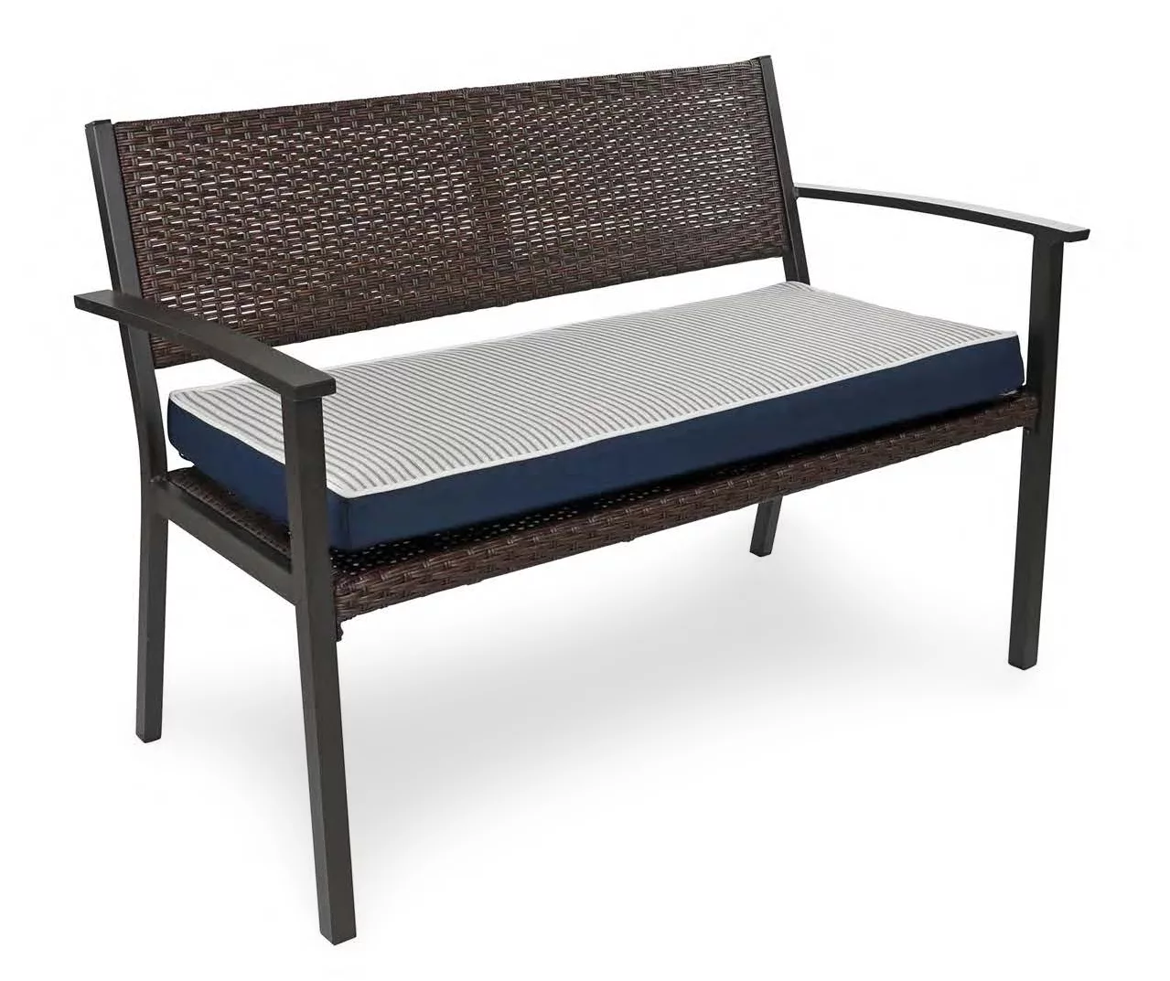 Add comfort and style to an outdoor bench using this deluxe cushion. Made of high performance solution dyed fabric that is fade, stain, mold and mildew resistant, the cushion features a decorative tick line pattern on one side as it reverses to a solid navy blue hue. Designed with gusseted sides with contrasting piping, this cushion is a wonderful update for seating on your patio, deck or porch.