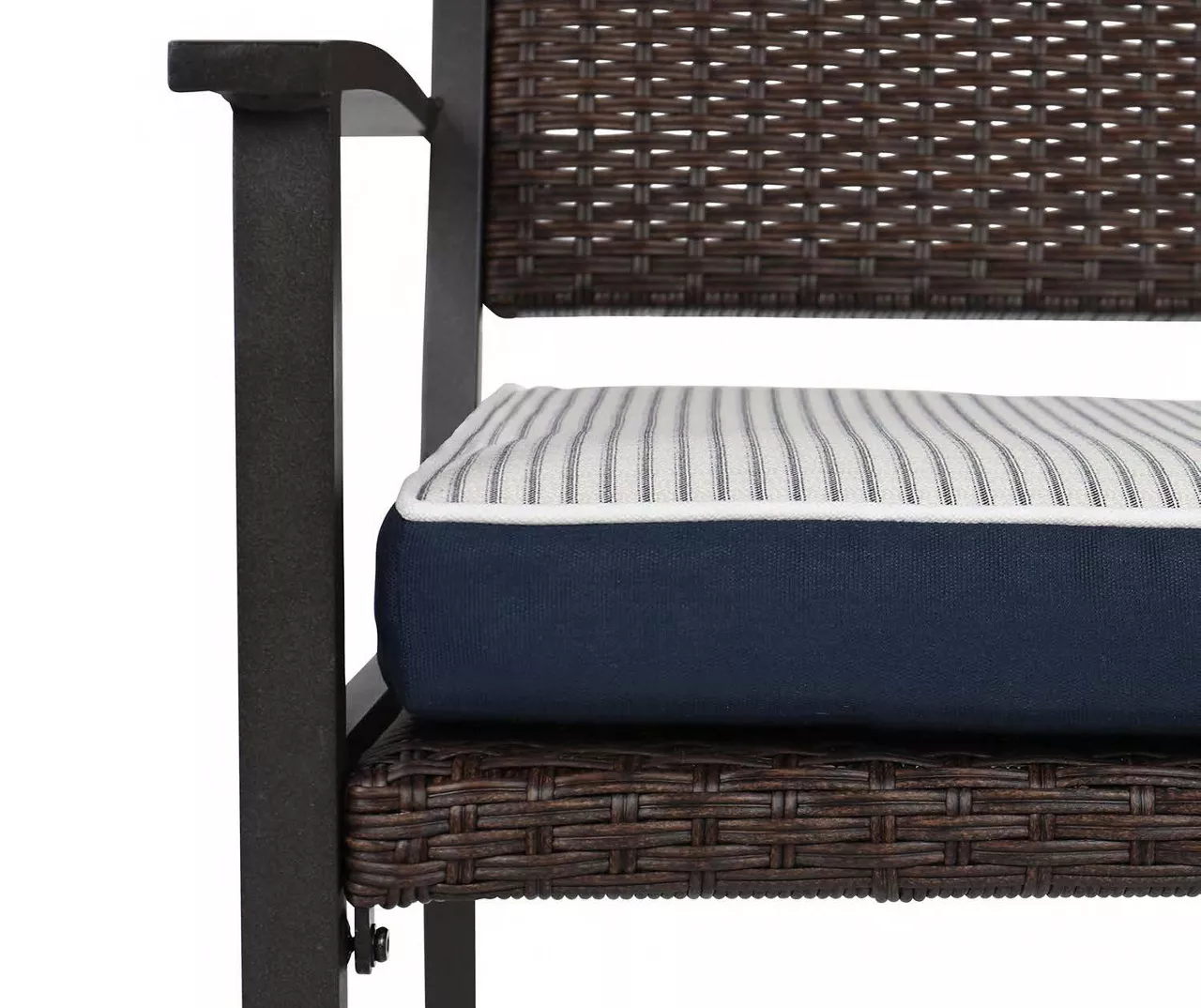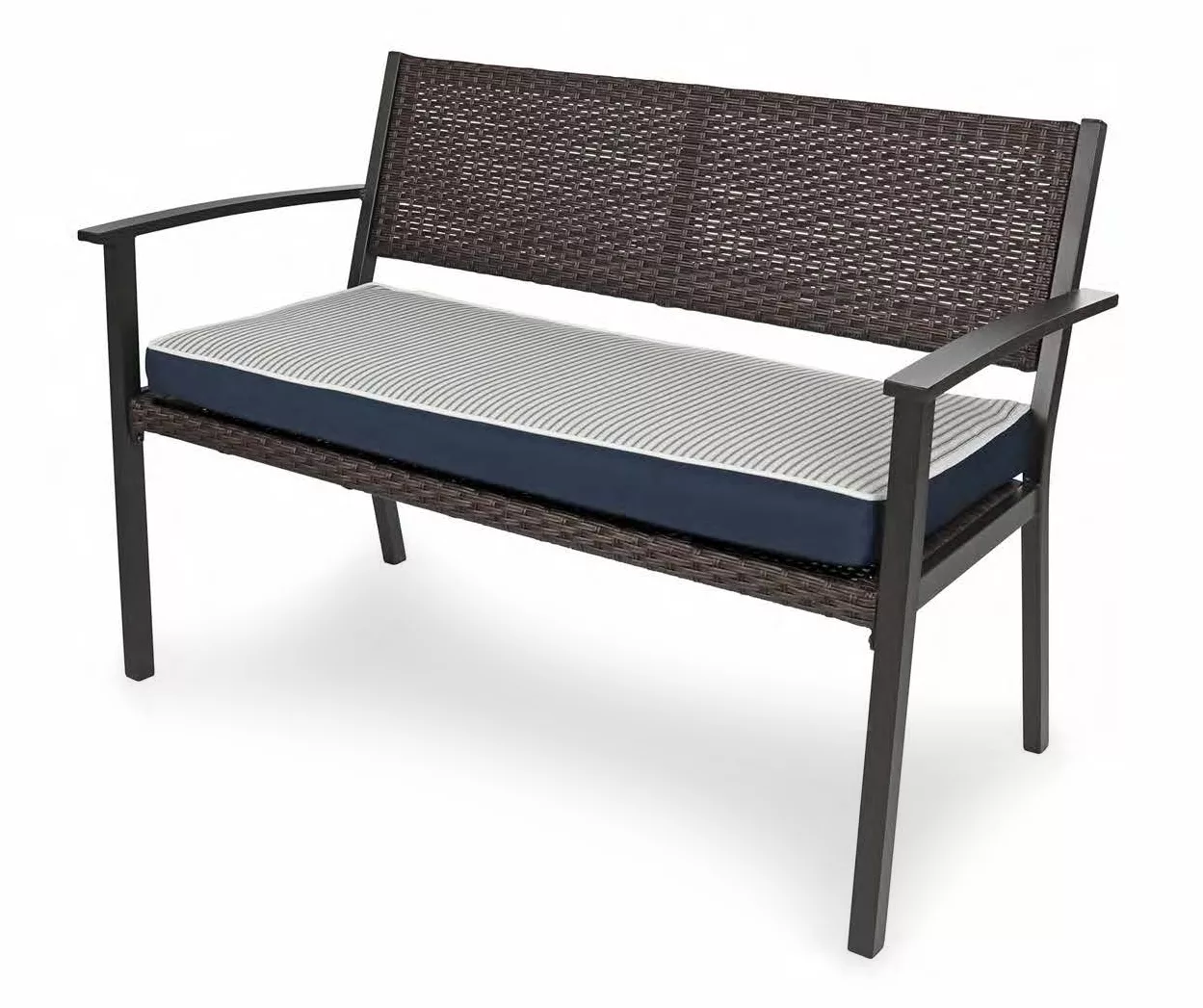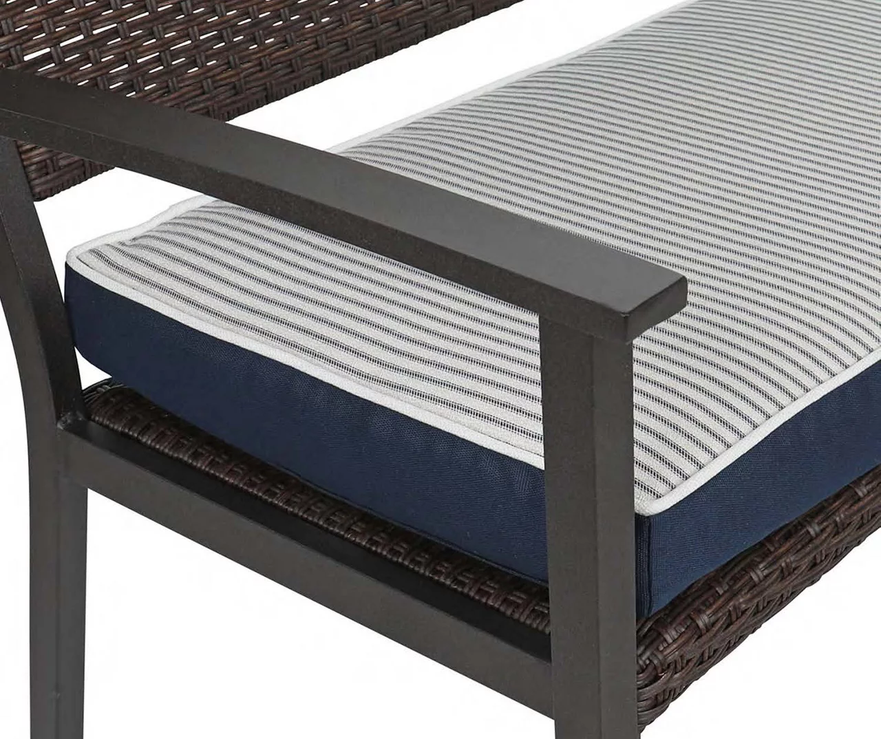 Add comfort and style to an outdoor bench using this deluxe cushion. Made of high performance solution dyed fabric that is fade, stain, mold and mildew resistant, the cushion features a decorative tick line pattern on one side as it reverses to a solid navy blue hue. Designed with gusseted sides with contrasting piping, this cushion is a wonderful update for seating on your patio, deck or porch.