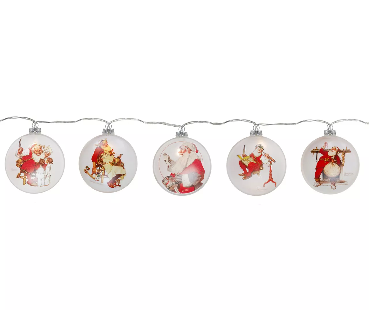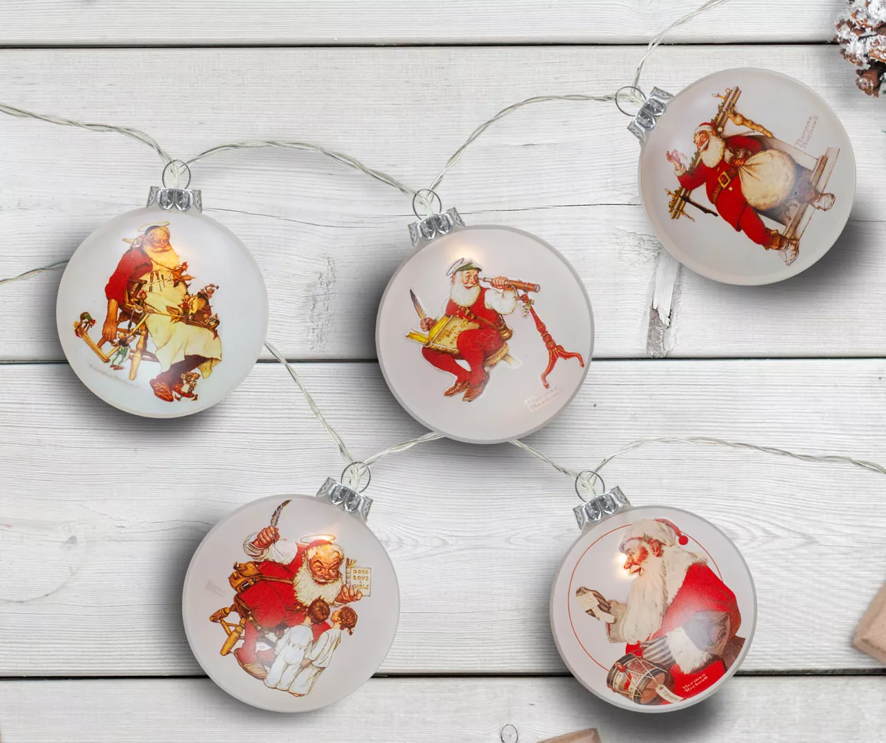Decorate your home for the holidays in classic art style using this Norman Rockwell-themed light set! The paintings include; ‘Santa and His Helpers’ ‘Checking Up’ ‘Filling the Stockings’ ‘Santa’s Visitors’ and ‘A Drum For Tommy’. Each print is on a white background with Norman Rockwell in red glitter on the back. Each disc is lit with a warm white LED light on a clear cord. The battery-operated feature allows you to place these lights in a multitude of places for a bit of holiday cheer.