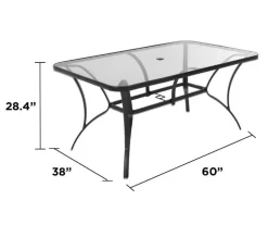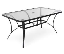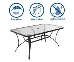 The Cosco Paloma steel dining table lets you share an outdoor meal with friends and family. Featuring a classic design with charcoal gray hues, this table will bring style to your outdoor space. The tempered glass top table is large and includes an umbrella opening (umbrella sold separately) for those bright, sunny days. Invite your friends over for a meal and enjoy this Cosco Paloma dining table.