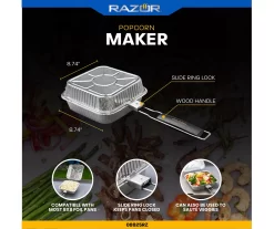Nothing like crispy, savory and fluffy popcorn made the old-fashioned way! The Razor popcorn maker is designed to produce the best homemade popcorn. Includes four disposable foil pans great for sauteing vegetables. Secured with a slide ring lock and stay-cool wood handle this creates the perfect tool for any movie night or sleepover activity.