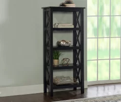 Classic simplicity and a chic black finish give this bookcase a handsome, versatile look that enhances any space. Ideal for a variety of styles from farmhouse to modern, this piece brings four tiers of storage and display space to your home. X-shaped sides add visual interest to the design while the neutral, black finish pops with any color scheme.