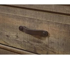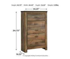 Keep clothing or items neatly contained in countryside style using this fantastic chest of drawers from Ashley. The Trinell chest is made from replicated barnwood that adds rustic visuals to your bedroom with pairing antique bronze hardware and nailhead trim. Five smooth-operating drawers are perfect for storing all your needs as the flat top displays décor.