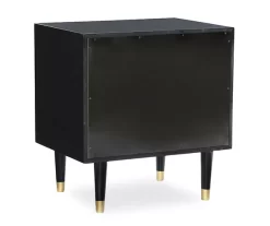 With its geometric patterned front, this geometric black nightstand will add texture and depth to your space. The nightstand has a full textured geometric front accented with square gold hardware and round, gold dipped legs. It is truly dressed to impress! Two deep drawers provide ample storage space for books, electronics and more. Its lovely black finish allows this piece to easily be incorporated into any existing decor.