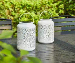 This classic solar lantern set with delicate flower cut-outs create intriguing graphic shadows, adds artisan beauty and flickering drama to your outdoor space. Bright warm white LED lighting charges throughout the day to automatically turn on at night and off at dawn. Designed with a handle for easy carrying and hanging, this lantern set is a beautiful addition to a porch, patio or garden.