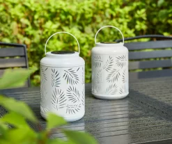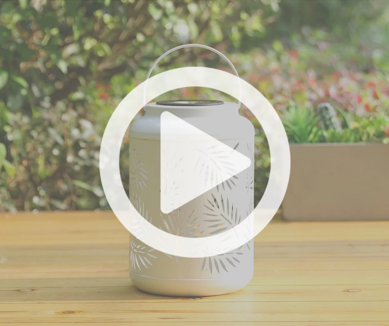 This classic solar lantern with delicate leaf cut-outs creates intriguing graphic shadows, adds artisan beauty and flickering drama to your outdoor space. Bright warm white LED lighting charges throughout the day to automatically turn on at night and off at dawn. Designed with a handle for easy carrying and hanging, this lantern is a beautiful addition to a porch, patio or garden.