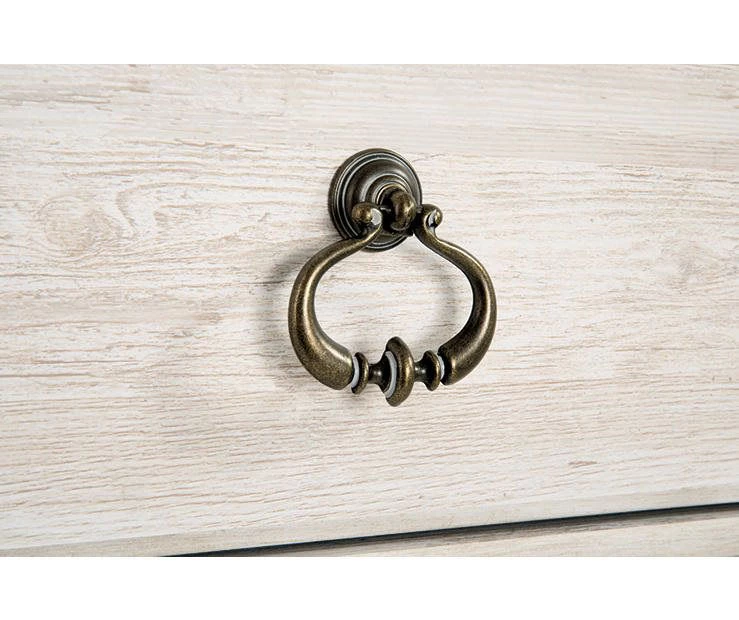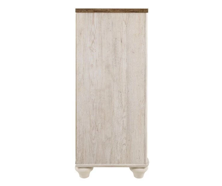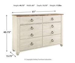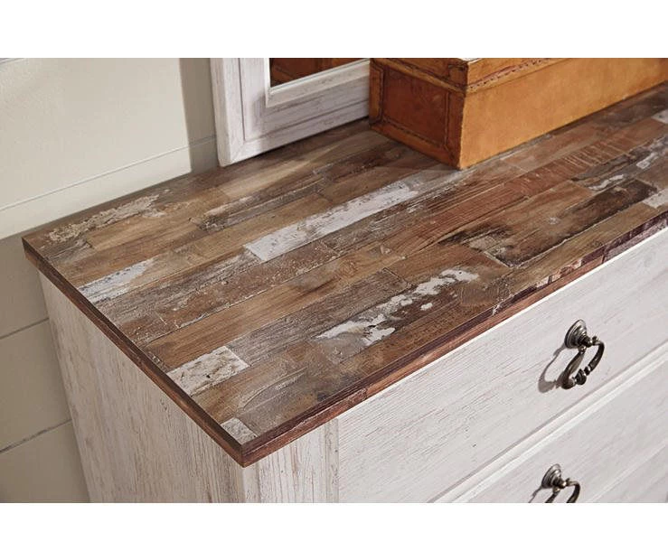 The Ashley Willowton dresser blends functionality with gorgeous farmhouse-inspired designs. A two-tone whitewash finish is replicated in a worn look for antique charm as a woodgrain block pattern accents the top in an authentic look. Complete with turned bun feet for an added classic touch, the drawers each with antique pulls store your clothes, accessories and personal items.